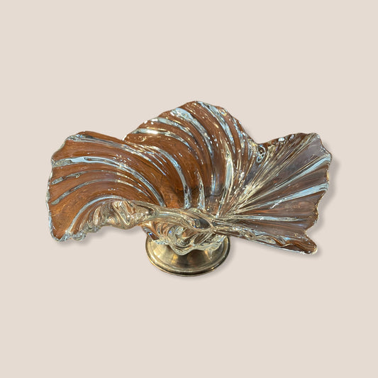Centrotavola vintage anni ‘70, realizzato in vetro, finemente lavorato e con base in argento ‘800. Diametro 32 h 13 cm