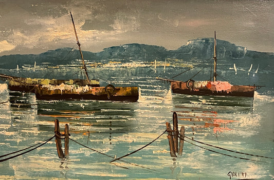 Dipinto olio su tela, marina, barche ormeggiate, XX secolo, Giolitti