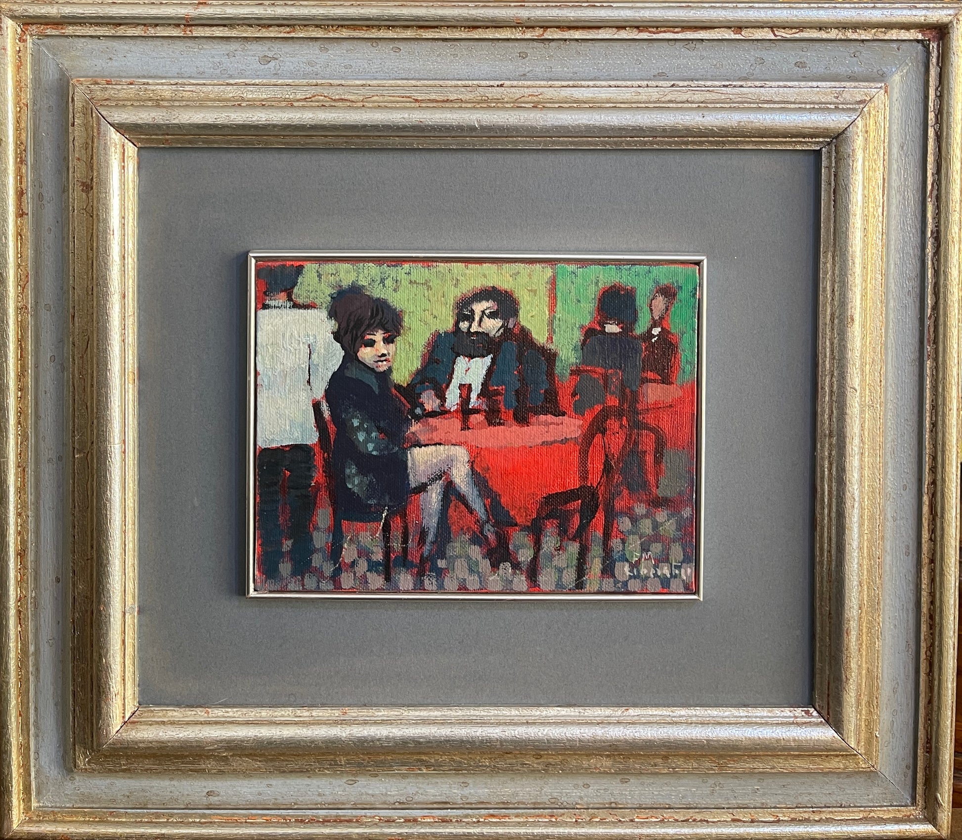 Dipinto a olio su tavola raffigura una scena d’interno di un caffè con figure.