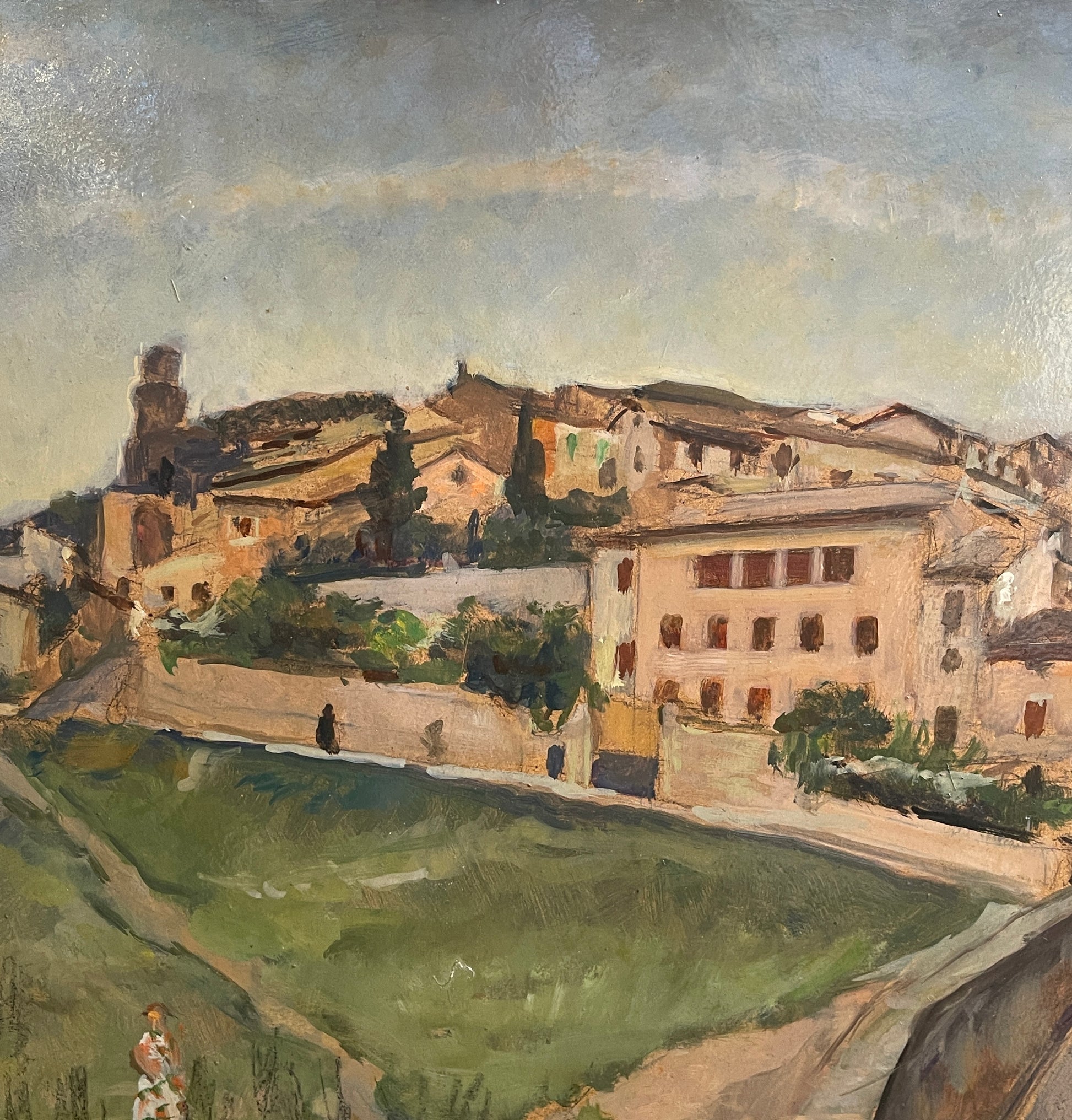 Grazioso dipinto raffigurante un paese di campagna arroccato su di una collina con figure.